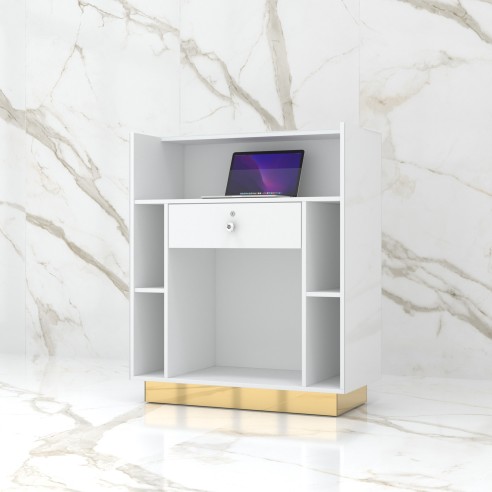 Lada recepcyjna standard z bestsellerowej kolekcji Silky. Przód, boki oraz nadstawka recepcji zostały wykonane z białego szkła. Na froncie jest umieszczone indywidualne logo klienta w wykończeniu lustrzanym. Podwyższony blat i całkowicie zabudowana podstawa zapewniają komfortową obsługę klienta w pozycji stojącej. Recepcja Standard stanowi optymalne rozwiązanie w lokalach, w których klient spędza krótki czas przy ladzie, np. tylko płaci lub umawia kolejną wizytę.